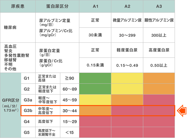 あなたは、透析治療を要する重症な腎不全になる危険性が高く、狭心症、心筋梗塞や脳卒中などの心血管疾患にかかりやすい状態です。多くの場合、腎臓専門医による治療が必要と考えられます。かかりつけ医の先生と相談していただくと良いでしょう。
