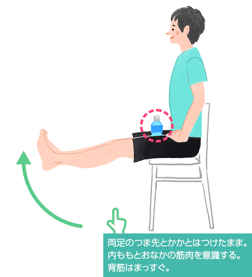 背筋を伸ばしてイスに座り、太ももの間にペットボトルを挟み膝を閉じる ペットボトルを挟んだまま、足を水平に上げる