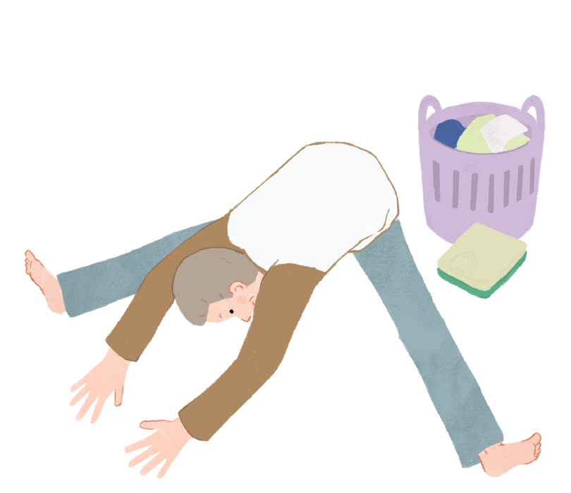 - ひざをまっすぐ伸ばし、つま先を立てて、腰を折るように上体を前にゆっくり倒す。