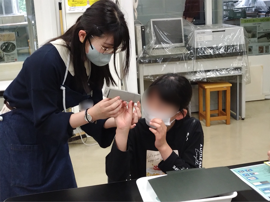 教室形式よりも、たくさんの子どもたちに工作を体験してもらえ、ほぼマンツーマンで接することができるからです。工作の内容は、「光」のカテゴリーから「カメラオブスキュラ」と「ブラックウォールボックス」のふたつを選びました。「カメラオブスキュラ」は、レンズとスクリーンを使って箱の中に像を映し出し、昔のカメラの仕組みを学ぶ工作です。「ブラックウォールボックス」は、偏光シートを使って、本来何もないはずの箱に黒い壁を出現させる工作で、光の性質について考えることができます。